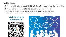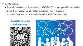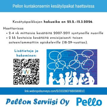 Pellon kunta ja Pellon Serviisi Oy tarjoavat jälleen kesätyöpaikkoja kesälle 2026. Haettavana olevat kesätyöt 2007-2011 syntyneille nuorille: vapaa-ajanpalvelut, 6 nuorta (2-4 vk) varhaiskasvatuspalvelut, 2...