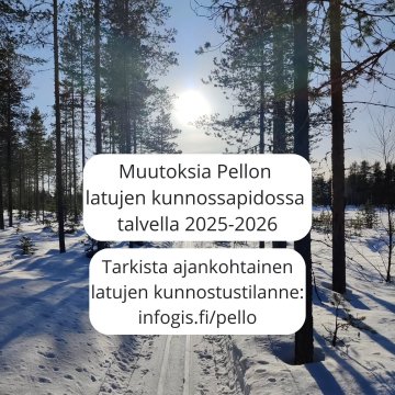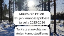 Pellon latujen ajankohtaisen kunnostustilanteen voi tarkistaa osoitteessa: https://www.infogis.fi/pello/ Joitakin poikkeuksia talven 2025–2026 latujen kunnostuksessa: Pellojärven latua ei kunnosteta ...