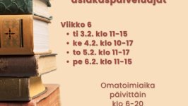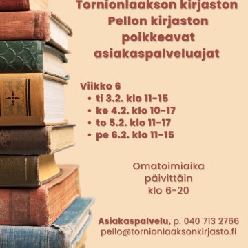Tornionlaakson kirjaston asiakaspalveluajoissa on talven 2026 aikana joitakin poikkeuksia: Viikko 6 ti 3.2. klo 11-15 ke 4.2. klo 10-17 to 5.2. klo 11-17 pe 6.2. klo 11-15 Omatoimiaika on käytössä...
