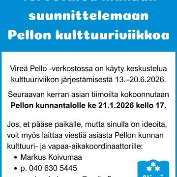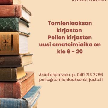 Tornionlaakson kirjaston Pellon toimipisteen omatoimiaika on muuttunut 16.1.2026 alkaen. Uusi omatoimiaika Pellon kirjastossa on klo 6-20. Muutokset johtuvat asiakastoiveista ja omatoimiajan valvonnan järjestelyistä. ...