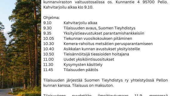 08.09.2023 Yksityistietilaisuus 13.9.2023 Pellossa Yksityisteiden osakkaille ja vastuuhenkilöille tarkoitettu info-tilaisuus pidetään keskiviikkona 13.9.2023 klo 9.30-11.45 Pellon kunnanviraston valtuustosalissa os. Kunnantie 4 95700 Pello. Kahvitarjoilu alkaa klo 9.10.... Lue uutinen