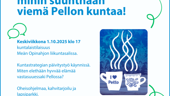 17.09.2025 Haluamme kuulla mitä kuntalaisilla on sanottavaa! Tervetuloa Pellon markkinoilla pe 19.9.2025 klo 10 alkaen Pello-teltalle kertomaan näkemyksiäsi Pellon ensi vuoden talouden suunnitteluun sekä kuntastrategian päivitykseen. Mihin satsataan ja mistä säästetään? Samalla... Lue uutinen