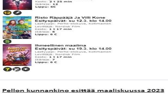 23.02.2023 Elokuvakone korjattu - Kunnankino toimii taas! Pellon kunnankinon elokuvakone on saatu korjattua ja elokuvat pyörivät taas! Tulepa sieki käymään elokuvissa! Lippu maksaa vain kuusi euroa, ja sillä saa kelpo elokuvaelämyksen. Elokuun Kunnankinon maaliskuun... Lue uutinen