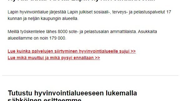 17.01.2023 Laphan uutiskirje kaikille lappilaisille Linkki: lue uutiskirje kokonaisuudessaan. Lapin hyvinvointialue järjestää Lapin julkiset sosiaali-, terveys- ja pelastuspalvelut 17 kunnan ja neljän kaupungin alueella. Lapin hyvinvointialueella työskentelee lähes... Lue uutinen