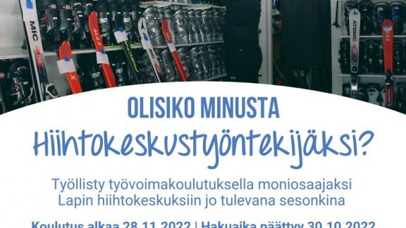 10.10.2022 Kouluttaudu hiihtokeskustyöntekijäksi Tarjolla hiihtokeskustyöntekijän koulutusta! Työllisty työvoimakoulutuksella moniosaajaksi kenties vaikkapa Ritavalkealle jo tulevana sesonkina. Koulutus alkaa 28.11.2022, hakuaika päättyy 30.10.2022. Katsoi... Lue uutinen