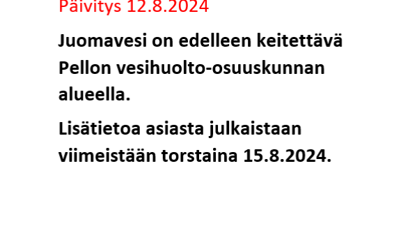 09.08.2024 PÄIVITYS JUOMAVESITILANTEESEEN: juomavesi Pellon vesiosuuskunnan alueella edelleen keitettävä Linkki tiedotteeseen JUOMAVESI ON EDELLEEN KEITETTÄVÄ PELLON VESIHUOLTO-OSUUSKUNNAN ALUEELLA Keittokehotus koskee koko Pellon vesihuolto-osuuskunnan toiminta-aluetta. Verkosto ulottuu kirkonkylän lisäksi... Lue uutinen