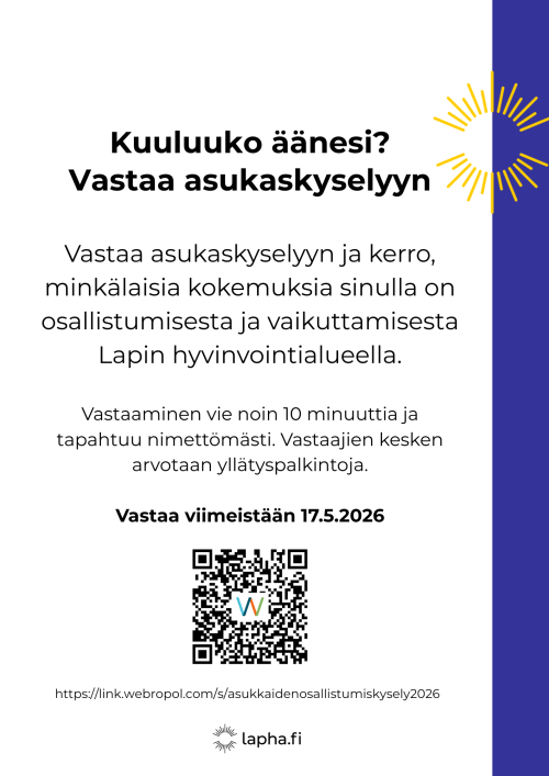 Julkaistu 21.04.2026 Kuuluuko äänesi? Vastaa asukaskyselyyn Vastaa asukaskyselyyn ja kerro, minkälaisia kokemuksia sinulla on osallistumisesta ja vaikuttamisesta Lapin hyvinvointialueella. Lapin hyvinvointialue toteuttaa asukkaille suunnatun kyselyn osallistumisen ja vaikuttamisen kokemuksista. Kyselyn avulla keräämme tietoa siitä, miten asukkaat kokevat omat vaikutusmahdollisuutensa sekä miten osallisuutta voidaan kehittää. Kerro mielipiteesi ja auta kehittämään palveluja vastaamalla asukaskyselyyn. Vastaaminen vie noin 10 minuuttia ja kysely on anonyymi. Kaikkien vastanneiden kesken arvotaan kolme keväistä yllätyspalkintoa. Kysely on avoinna 17.5.2026 klo 23.59 saakka. Kyselylinkki