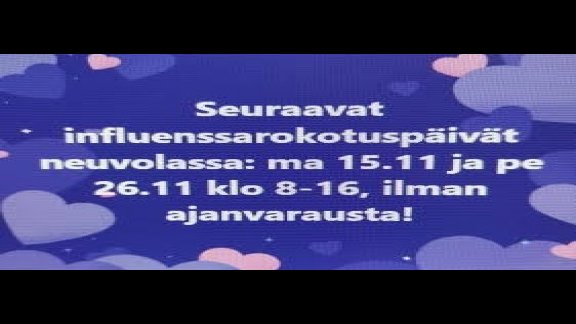 27.10.2022 Pellon neuvola tiedottaa rokotuksista Influenssarokotukset ilman ajanvarausta lauantaina 29.10 klo 9 - 14 keskiviikkona 16.11 klo 9 - 16 Maksuttomaan influenssarokotukseen ovat oikeutettuja: Raskaana olevat Kaikki 65 vuotta täyttäneet ... Lue uutinen