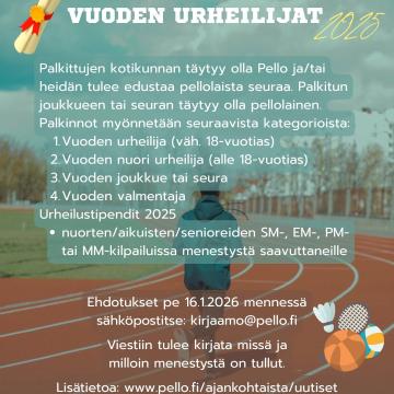Kuka sinun mielestäsi ansaitsee vuoden 2025 urheilijapalkinnot? Palkittujen kotikunnan täytyy olla Pello ja/tai heidän tulee edustaa pellolaista...