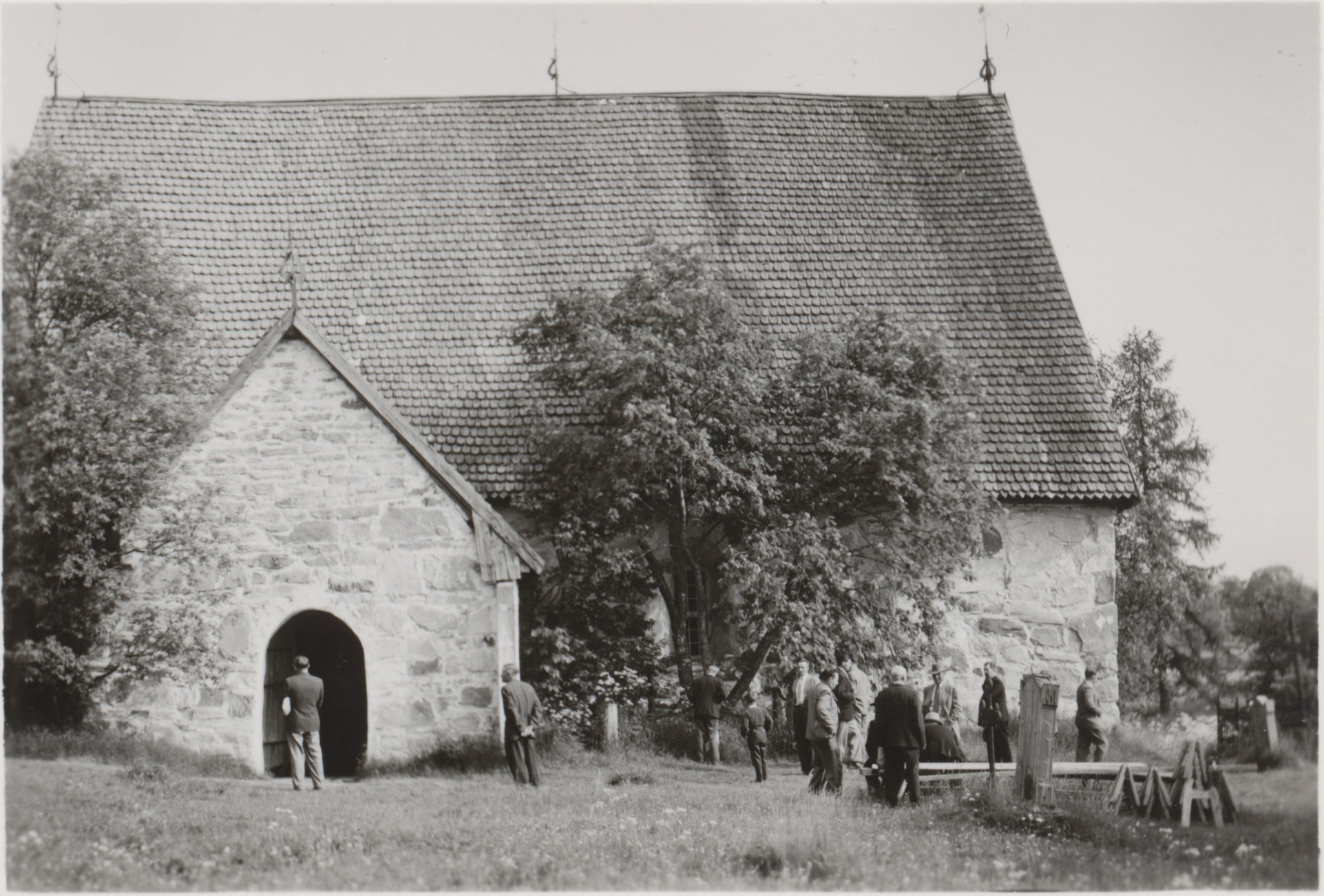 28. Väkeä rakennuksen pihalla