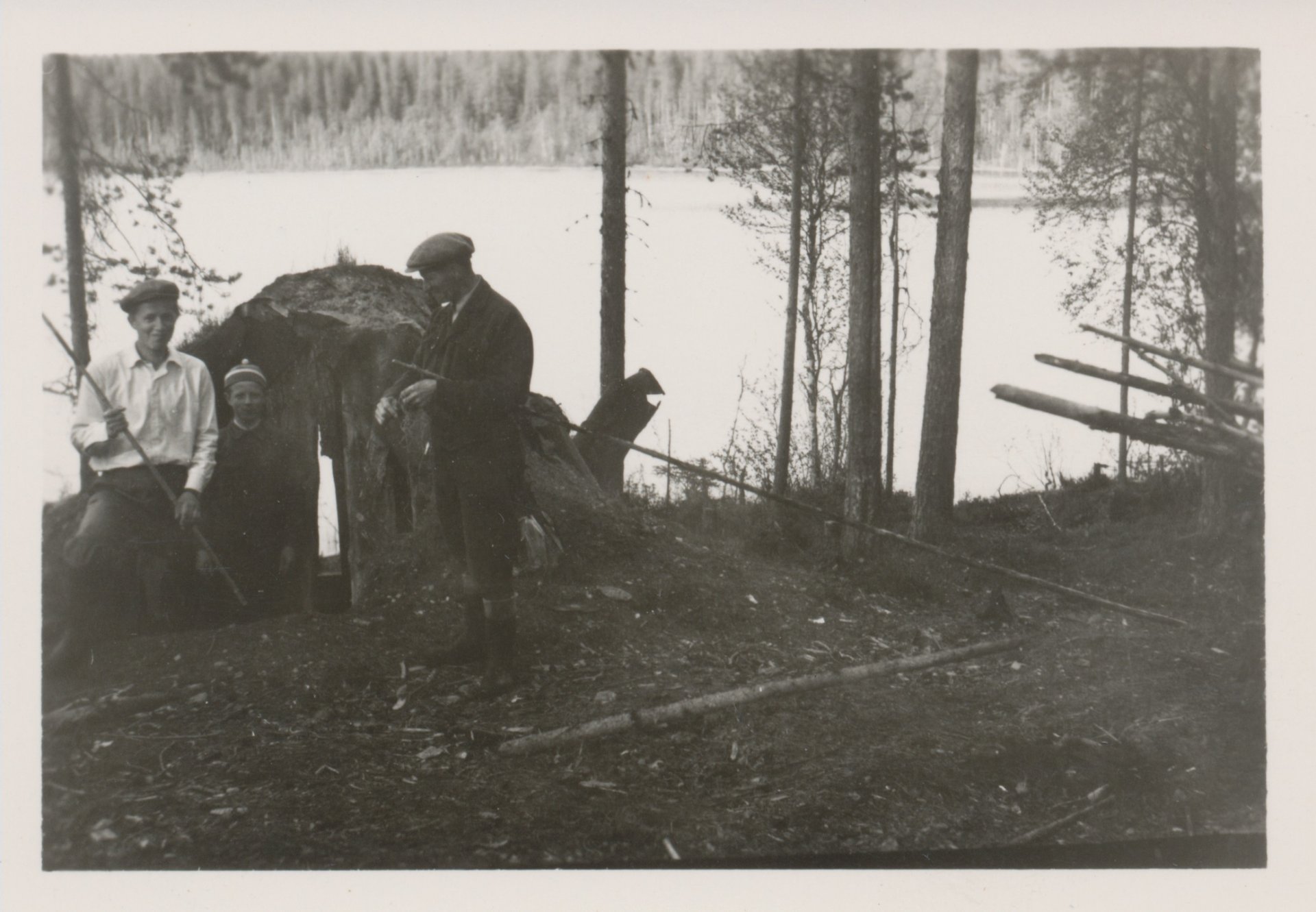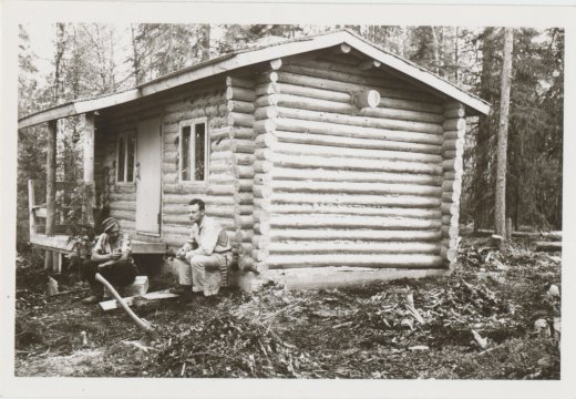 53. Miehet mökin vieressä pitämässä taukoa