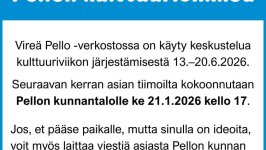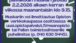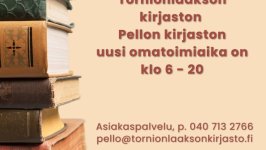 Tornionlaakson kirjaston Pellon toimipisteen omatoimiaika on muuttunut 16.1.2026 alkaen. Uusi omatoimiaika Pellon kirjastossa on klo 6-20. Muutokset johtuvat asiakastoiveista ja omatoimiajan valvonnan järjestelyistä. ...
