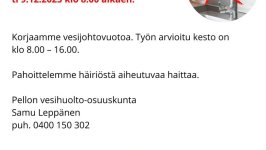 Pellon vesihuolto-osuuskunta tiedottaa: Mahdollisia toimituskatkoksia talousveden jakelussa Nivanpäässä ti 9.12.2025 klo 8.00 alkaen. Korjaamme...