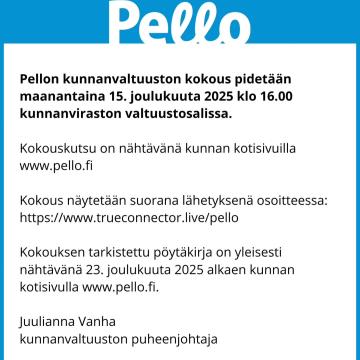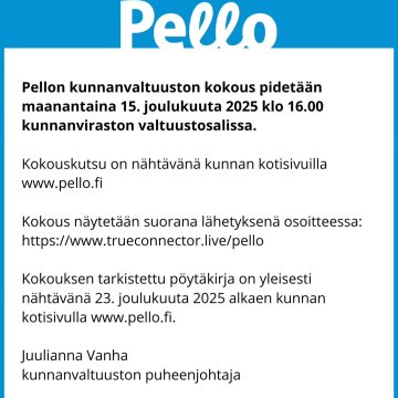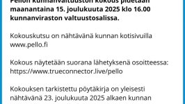 Pellon kunnanvaltuuston kokous pidetään maanantaina 15. joulukuuta 2025 klo 16 kunnanviraston valtuustosalissa. Kokouskutsu on nähtävissä kunnan...