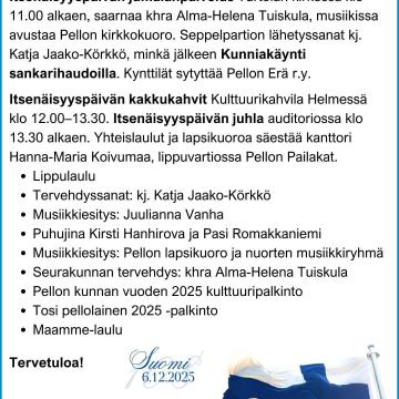 Tornionlaakson kirjaston asiakaspalveluajoissa on syksyn 2025 aikana joitakin poikkeuksia: Viikko 48 torstaina 27.11. klo 11-15 Viikko 49 perjantaina 5.12. klo 10–15, itsenäisyyspäivän aatto. ...